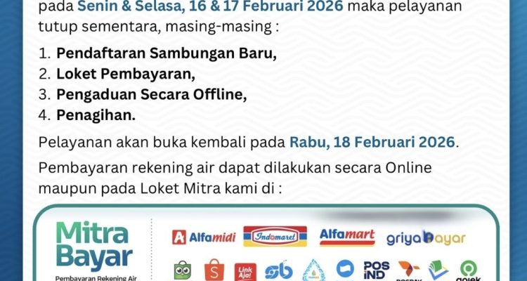 Informasi Gangguan Layanan Distribusi Air Headline|6 Februari 20266 Februari 2026oleh admin Akan dilakukan penanggulangan kebocoran pipa di Jl. K.H. Ahmad Razak (Depan Indomaret