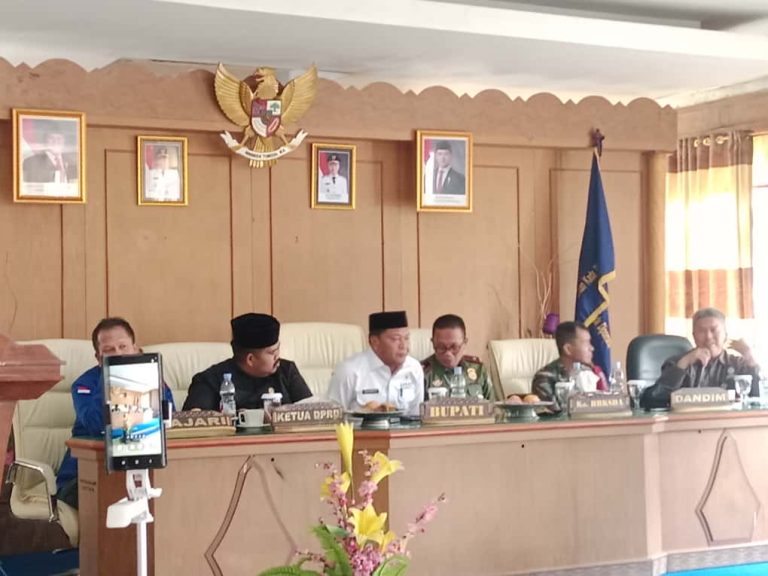 MAMASA – Bupati Mamasa, Welem Sambolangi, memimpin diskusi terbuka bersama masyarakat dan tokoh adat terkait penetapan batas Taman Nasional Gandang Dewata (TNGD), yang digelar di Ruang Pola Kantor Bupati Mamasa, Rabu (8/10/2025).